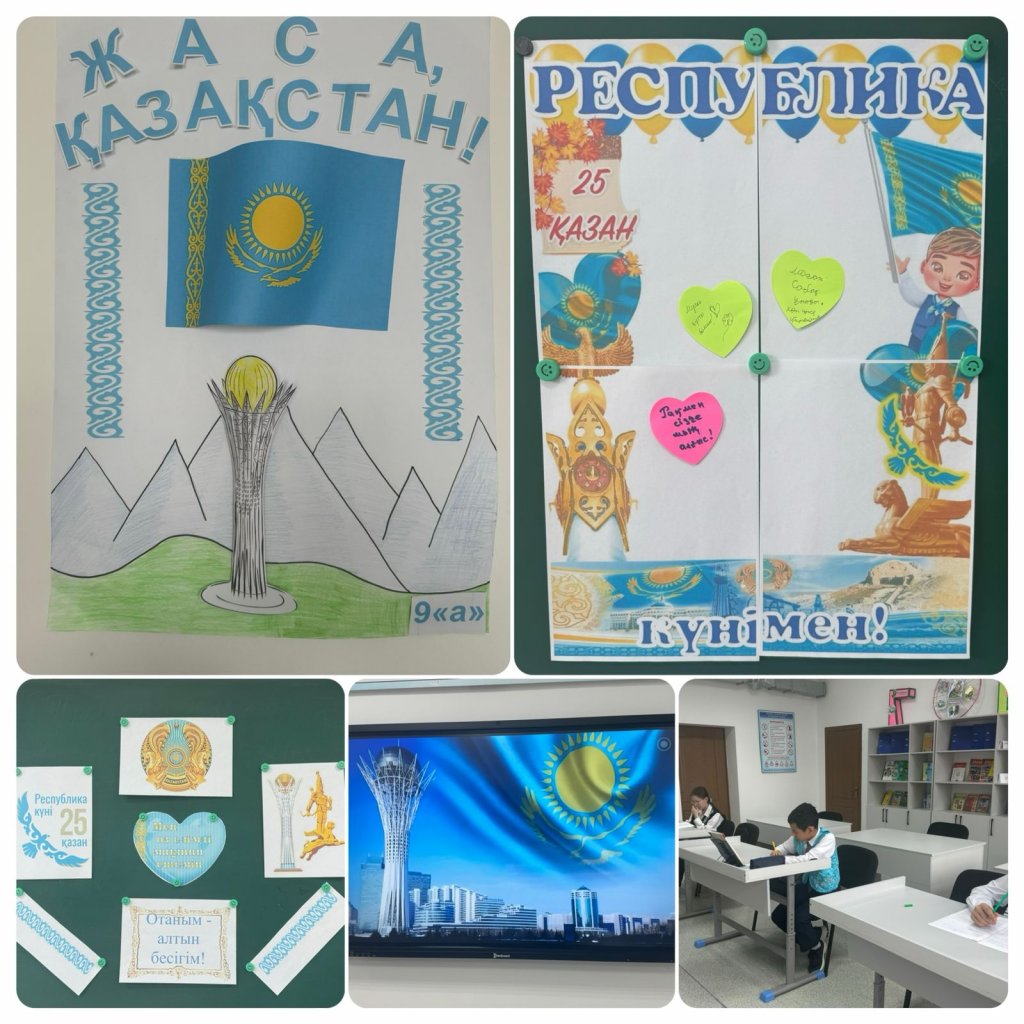 Оқушыларға Республика күні мерекесінің маңызын түсіндіру, елге, жерге деген сүйіспеншілікті арттыру, отансүйгіштік құндылықтарын бойына сіңіру мақсатында «Қазақ елі -Отаным менің!» атты 25 қазан-Республика күніне арналған сынып сағаты 9 а сыныбында өтті. Оқушылар берілген тапсырмаларды орындап, кері байланыс жасады.